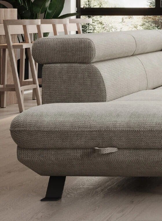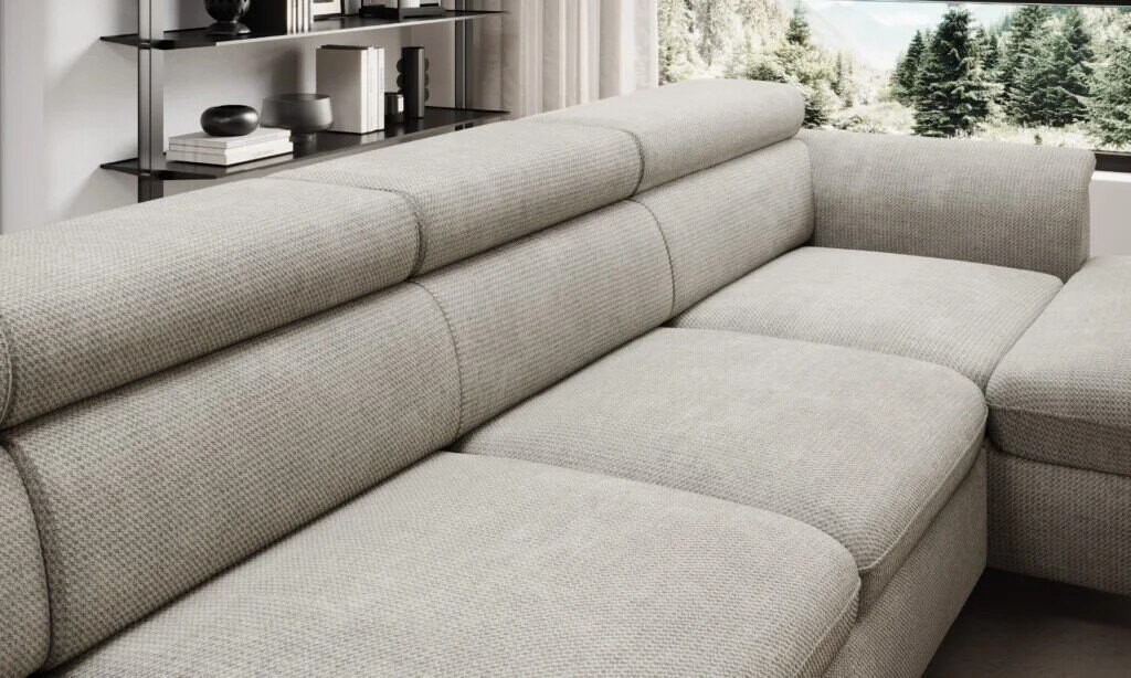 Funkcjonalność tego modelu sprosta oczekiwaniom nawet najbardziej wymagających użytkowników. Regulowane zagłówki w kilku segmentach umożliwiają pełne dopasowanie wysokości oparcia do indywidualnych preferencji. Wnętrze siedzisk oparto na sprężynach falistych, co zapewnia sprężystość, komfort i odporność na deformacje. Konstrukcja narożnika zachęca do wypoczynku zarówno w pozycji siedzącej, jak i półleżącej – idealnie sprawdzi się jako centralny punkt rodzinnej strefy relaksu.
