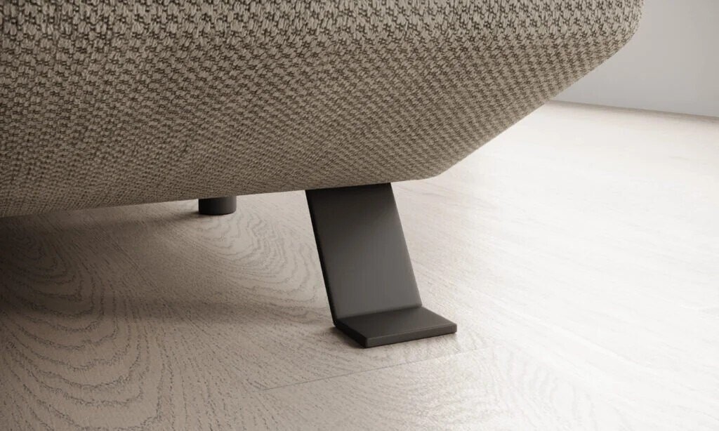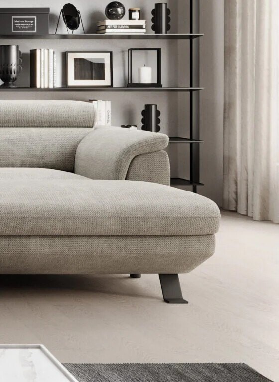 Luni XL to rozbudowany narożnik o harmonijnej konstrukcji, która łączy prostotę formy z subtelnym akcentem miękkich zaokrągleń. Jasna tapicerka o wyraźnej fakturze podkreśla segmentowy układ mebla i nadaje mu elegancki, spokojny charakter. Grube poduchy siedziskowe i profilowane zagłówki wspierają ergonomię, a lekko wygięte podłokietniki nadają bryle łagodny, przyjazny wyraz. Solidne nogi w kolorze czerni kontrastują z delikatnym materiałem, akcentując nowoczesną linię narożnika.