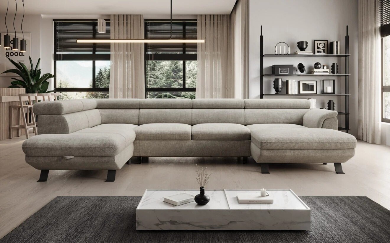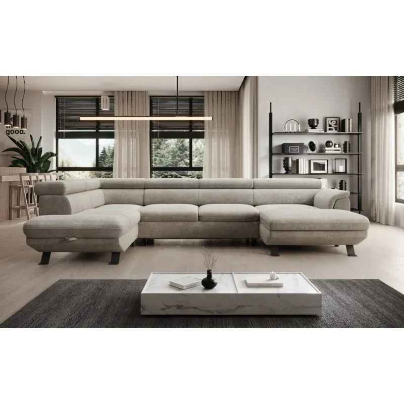 Luni XL wyposażono w funkcję spania typu Delfin z powierzchnią o wymiarach 125 x 267 cm, co czyni go praktycznym rozwiązaniem także na okazjonalne noclegi. Dodatkowy pojemnik na pościel ukryty w jednym z segmentów ułatwia przechowywanie. Możliwość wyboru obicia w tkaninie klasycznej, ekoskórze czy materiałach odpornych na zabrudzenia pozwala dostosować model do każdego wnętrza – od minimalistycznych po bardziej klasyczne.