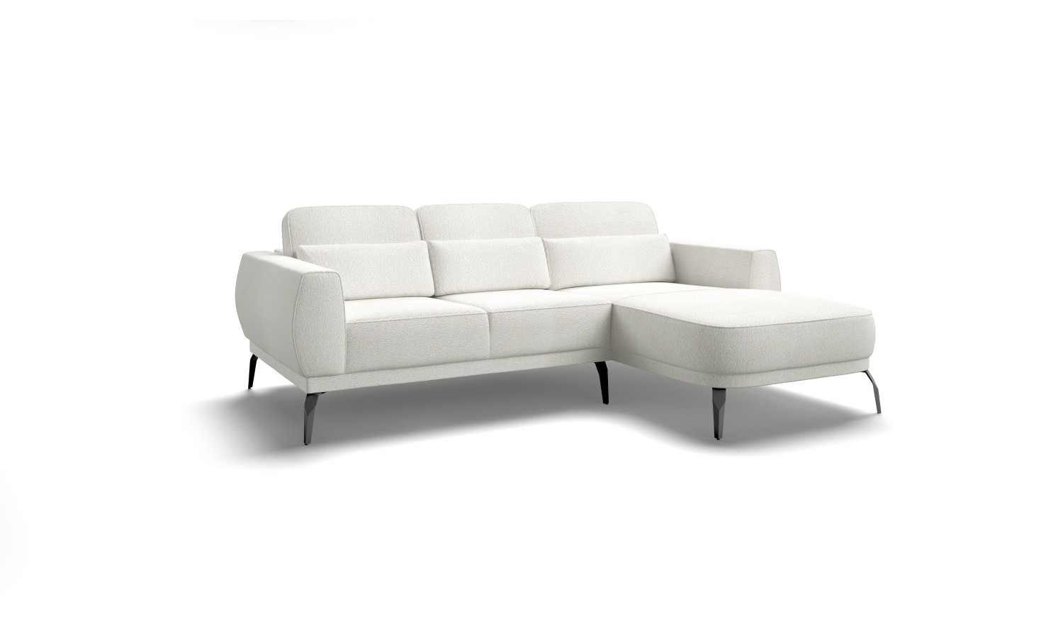 Elegancki narożnik o neutralnej, szarej kolorystyce prezentuje harmonijne połączenie nowoczesnego designu z funkcjonalnością. Charakterystyczne zaokrąglone kształty siedzisk i oparć tworzą przyjazną, nieformalną atmosferę, a smukłe metalowe nóżki dodają całości lekkości wizualnej. Model wyróżnia się regulowanymi zagłówkami, które można ustawić w różnych pozycjach, zapewniając optymalny komfort użytkowania.