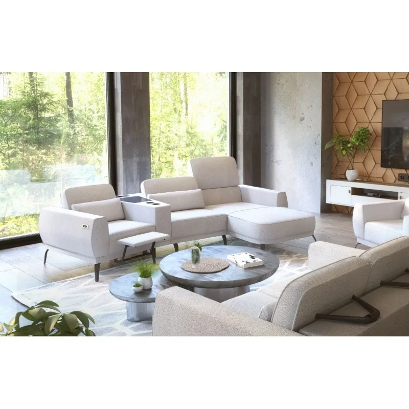 Luksusowy narożnik w jasnej, kremowej tapicerce prezentuje się jako prawdziwe centrum relaksu dzięki zaawansowanym funkcjom komfortowym. Charakterystyczny elektryczny podnóżek oraz praktyczny barek centralny tworzą wyjątkowy mebel, który łączy elegancję z nowoczesnymi rozwiązaniami technologicznymi. Smukłe chromowane nóżki podkreślają jego premium charakter, a regulowane zagłówki pozwalają na indywidualne dopasowanie pozycji wypoczynku.