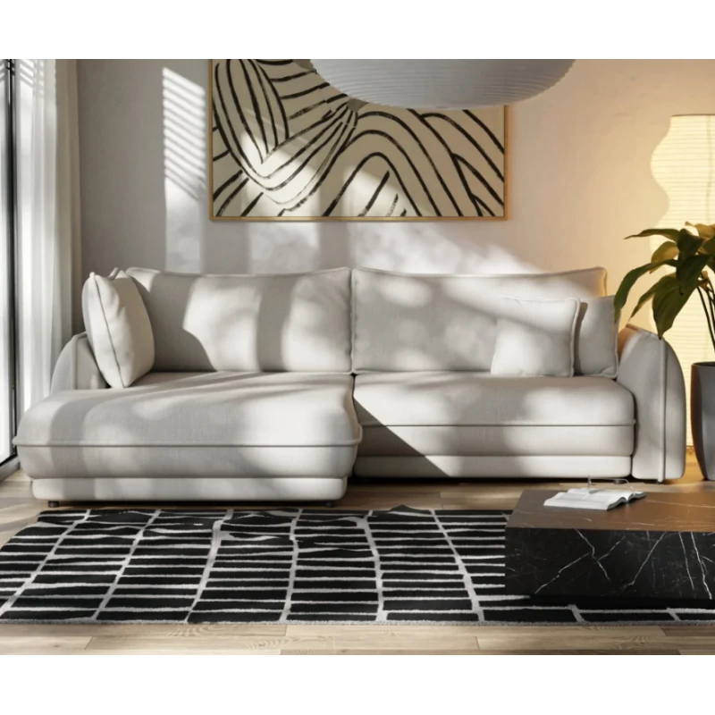Orfeo II to narożnik o wyraźnie zaokrąglonej linii, który zachwyca prostotą formy i nowoczesnym wyrazem. Miękka, jasnobeżowa tkanina tworzy spójną całość z delikatnie wyprofilowanymi podłokietnikami oraz dużymi, wypchanymi poduszkami oparciowymi. Przemyślane proporcje i wizualna lekkość mebla sprawiają, że z łatwością odnajdzie się zarówno w większych, jak i średnich wnętrzach. Gładka tapicerka i solidna podstawa podkreślają jakość wykonania oraz dbałość o detal.
