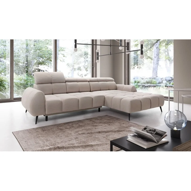 Braga to nie tylko styl, ale i funkcjonalność – dzięki elektrycznemu mechanizmowi wysuwania siedziska, narożnik zyskuje przestrzeń do spania o wymiarze 236x87 cm. Komfort użytkowania zapewniają sprężyny faliste oraz pianka PU o odpowiedniej gęstości, które wspólnie tworzą miękkie, a zarazem wspierające siedzisko. Konstrukcja oparta na solidnym, drewnianym stelażu gwarantuje trwałość, a przemyślana geometria narożnika umożliwia ustawienie go zarówno w większym salonie, jak i w otwartej przestrzeni dziennej.