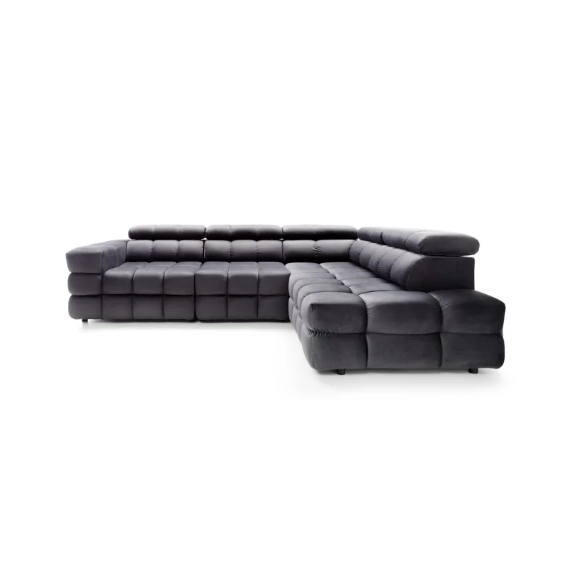 Model Nimides przykuwa uwagę konstrukcją opartą na rytmicznych przeszyciach, które tworzą efekt głębokiego pikowania na całej powierzchni narożnika. Mięsista forma tapicerki i równomiernie rozłożone, miękkie segmenty nadają całości niemal architektoniczny charakter. Ciemna tkanina o lekko welwetowej strukturze podkreśla luksusowy wygląd mebla, a opcjonalne unoszone zagłówki pozwalają użytkownikowi dopasować oparcie do indywidualnych preferencji. Forma narożnika jest masywna, ale wyważona, co sprawia, że dominuje we wnętrzu w bardzo świadomy, elegancki sposób.
