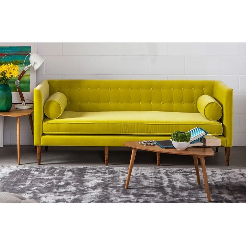 Prezentowany model może zostać wykonany w dowolnym odcieniu, ponieważ sam decydujesz, jaki rodzaj materiału tapicerskiego wybierzesz. Aby mebel nabrał indywidualnego charakteru, również jego drewniana podstawa może zostać wybarwiona na dowolny kolor z dostępnej gamy kolorystycznej – od bieli, poprzez odcienie brązu, aż po czerń. Sofa na wysokich nóżkach w zestawie jest wyposażona w dwie poduszki w kształcie walców oraz wygodne podłokietniki. Charakteru temu meblowi, oprócz drewnianych detali, dodaje pikowane oparcie, które wygląda ciekawie i jest obietnicą relaksu dla zmęczonych pleców.