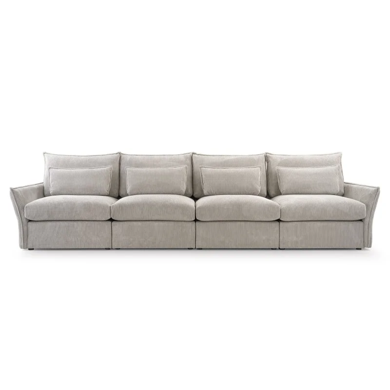 Sofa modułowa Noel 350 cm wyróżnia się harmonijną, elegancką formą i przemyślaną konstrukcją. Jej szerokie, głębokie siedziska i miękkie poduszki zapewniają wyjątkowy komfort, a subtelnie zaokrąglone boczki nadają jej lekkości. Tapicerka z tkaniny o wyrazistej, prążkowanej strukturze dodaje meblowi unikalnego charakteru i podkreśla jego nowoczesny design. Dzięki przestronnej powierzchni sofa Noel świetnie sprawdzi się w dużych salonach, tworząc stylowe i funkcjonalne miejsce do wypoczynku.