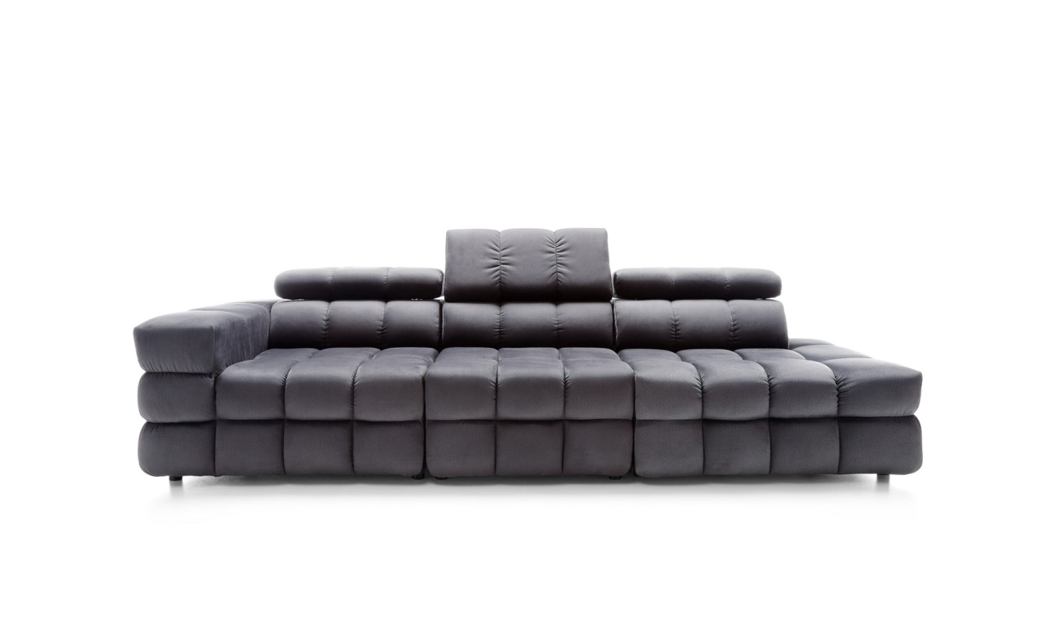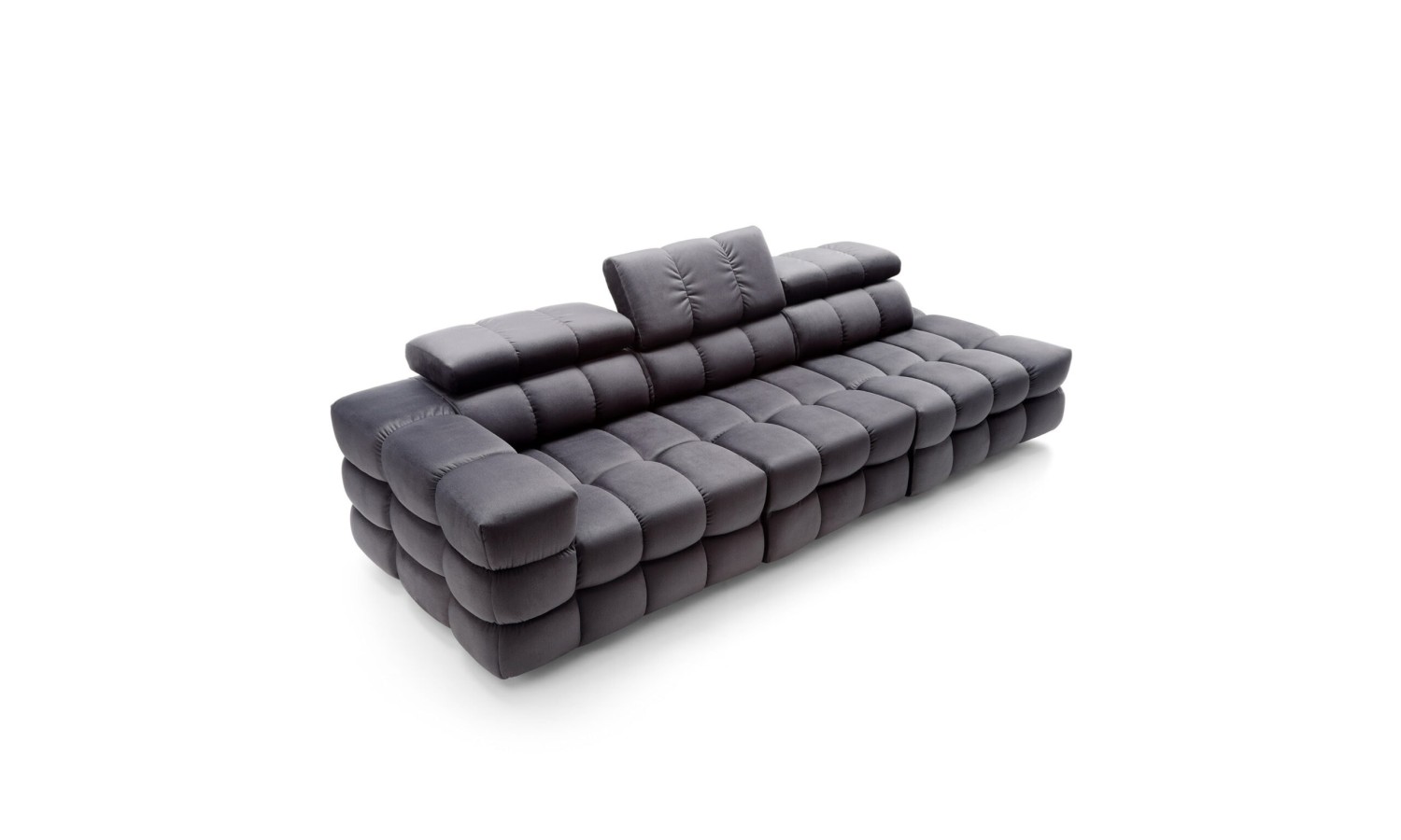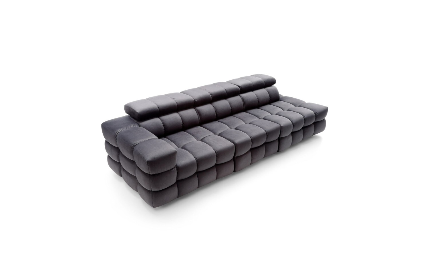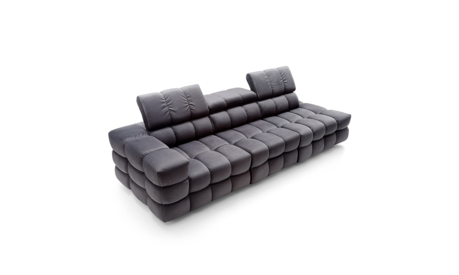 Powierzchnia siedzisk w kanapie Nimides przypomina misternie zszywaną mozaikę – każde przeszycie zostało tu precyzyjnie zaplanowane, by nadać meblowi wyjątkową głębię i wyrazistość. Miękkie moduły w układzie poziomych i pionowych podziałów tworzą harmonijną strukturę, która zachwyca swoją rzeźbiarską formą. Ciemna tapicerka podkreśla ekskluzywny charakter mebla, a zagłówki o regulowanej wysokości dodają elegancji i praktyczności. Forma kanapy przyciąga wzrok – jest masywna, ale nie przytłacza; dynamiczna, lecz zrównoważona w proporcjach.