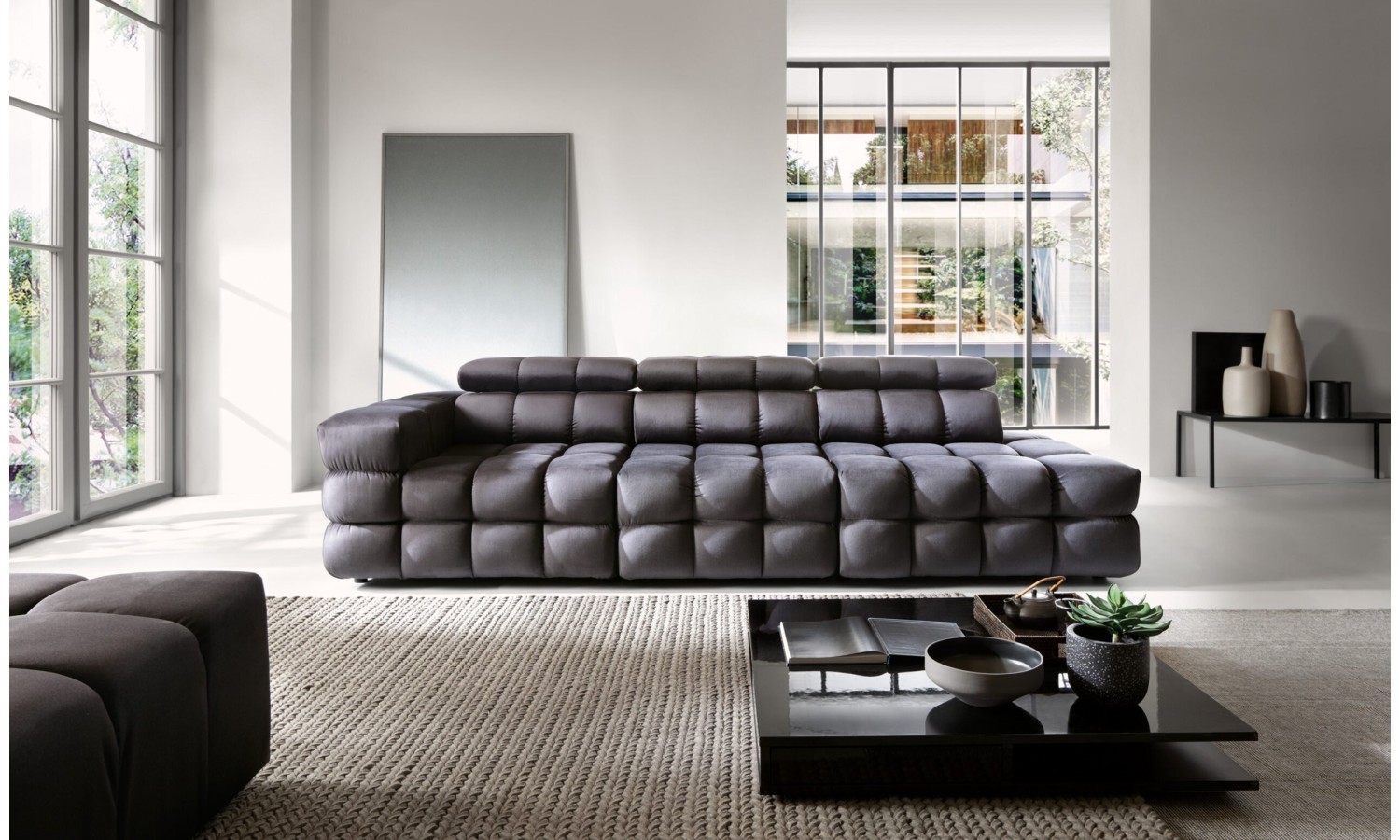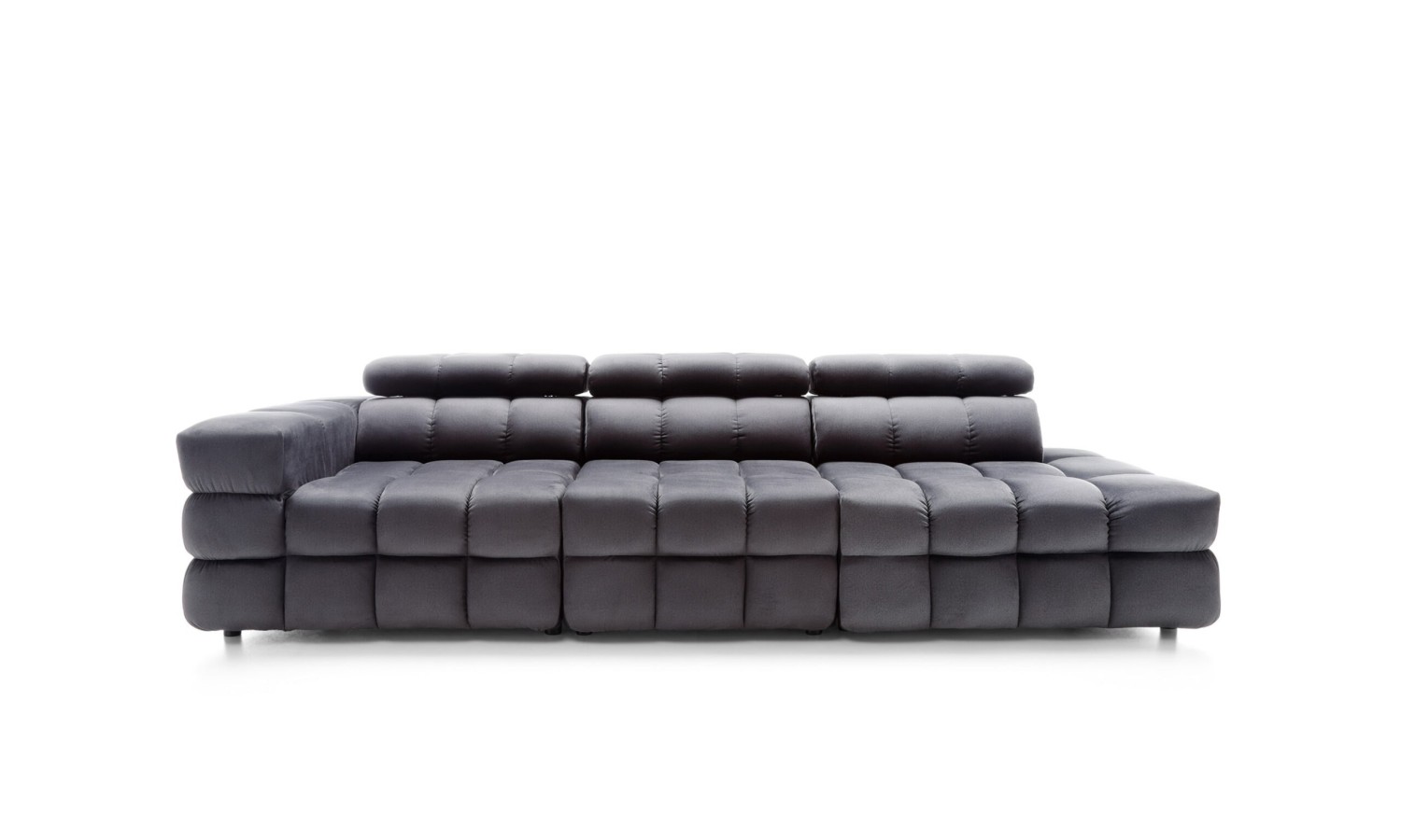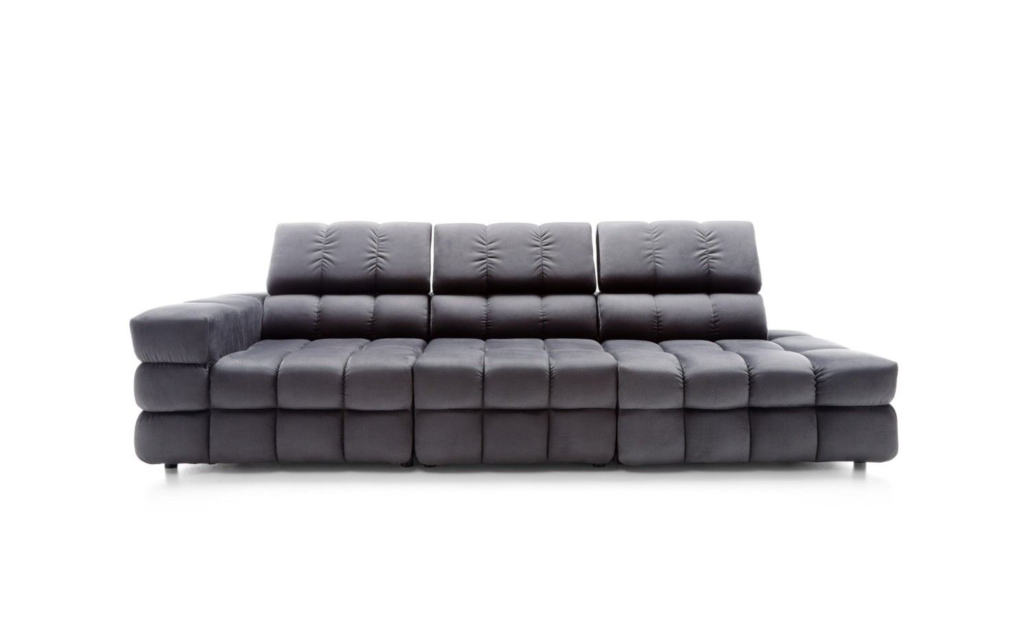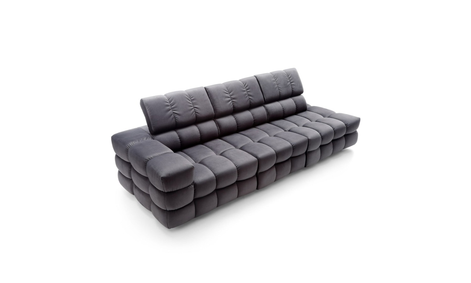Powierzchnia siedzisk w kanapie Nimides przypomina misternie zszywaną mozaikę – każde przeszycie zostało tu precyzyjnie zaplanowane, by nadać meblowi wyjątkową głębię i wyrazistość. Miękkie moduły w układzie poziomych i pionowych podziałów tworzą harmonijną strukturę, która zachwyca swoją rzeźbiarską formą. Ciemna tapicerka podkreśla ekskluzywny charakter mebla, a zagłówki o regulowanej wysokości dodają elegancji i praktyczności. Forma kanapy przyciąga wzrok – jest masywna, ale nie przytłacza; dynamiczna, lecz zrównoważona w proporcjach.