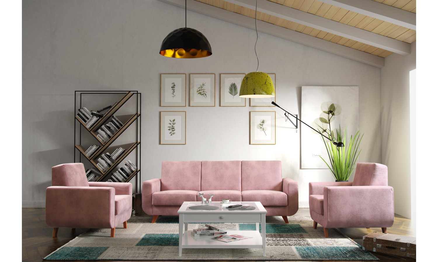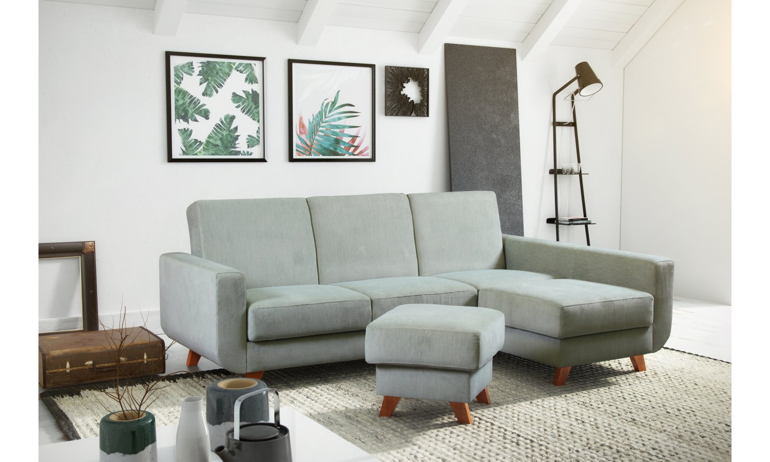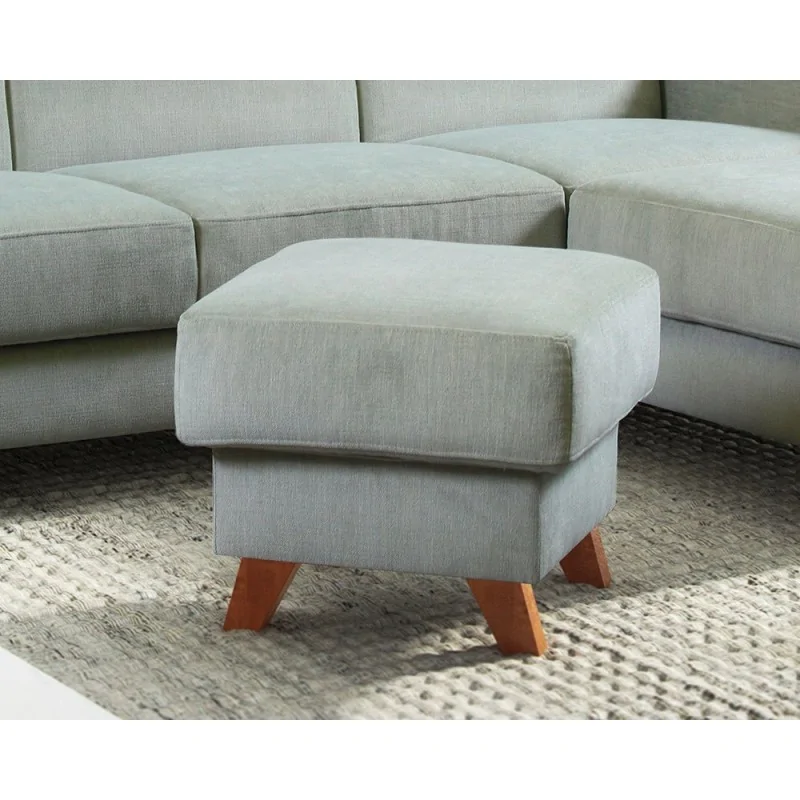 Pufa Sanremo to element rozbudowanego kompletu wypoczynkowego, w skład którego wchodzą rozkładany narożnik, sofa oraz fotele.