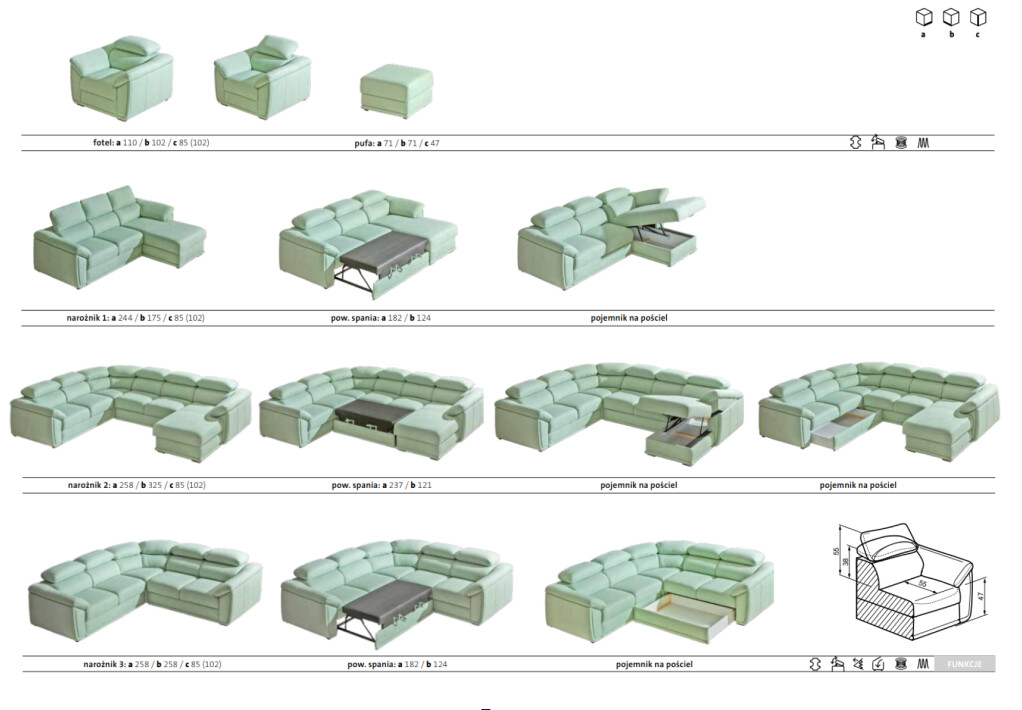 Pufa Serifos to niewielki mebel, który może stanowić efektowne uzupełnienie nowoczesnego salonu, nie zajmując przy tym dużo miejsca. Wraz z innymi meblami z kolekcji Serifos tworzy stylową i funkcjonalną całość. Pufa Serifos może być wykorzystywana jako wygodne siedzisko lub praktyczny podnóżek. Pufę Serifos, jak i inne meble z tej kolekcji, można wykonać w tkaninie, ekoskórze lub skórze naturalnej. Pufa Serifos została zaprojektowana tak, aby mogła pełnić funkcję niezależnego miejsca do siedzenia lub też stanowić dopełnienie kompletu mebli wykonanych w tym samym wzornictwie. Jej zaletą są rozmiary, dzięki którym nie tylko jest wygodnym siedziskiem, ale może być przedłużeniem fotela lub sofy w formie wygodnego podnóżka. Wzornictwo mebla jest typowe dla całej kolekcji Serifos i wyróżnia się prostotą oraz łagodnymi, wyokrąglonymi krawędziami. W pufie dodatkowo zastosowano konstrukcję trzypoziomową, dzięki której jest ona bardziej urozmaicona i elegancka. Mebel zbudowany na sprężynach falistych i bonellowych jest odporny na odkształcenia.