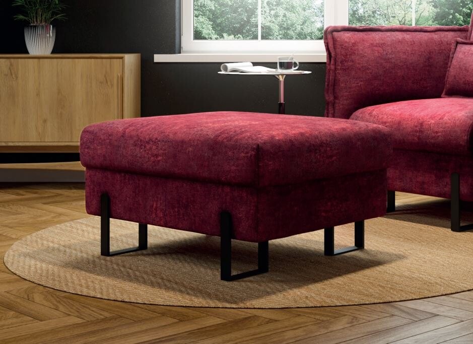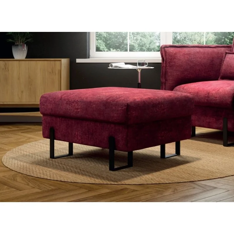 Pufa Kenzo o wymiarach 90x74 cm to stylowy i praktyczny dodatek, który idealnie dopełnia każdy salon lub strefę wypoczynkową. Wykonana z tkaniny w intensywnym bordowym kolorze, wprowadza do wnętrza ciepło i elegancję, a jej gładka, miękka powierzchnia dodaje przestrzeni przytulności. Minimalistyczny design pufy, oparty na prostych liniach i subtelnych detalach, sprawia, że świetnie komponuje się z różnorodnymi stylami wnętrzarskimi, od nowoczesnych po bardziej klasyczne aranżacje. Smukłe, czarne metalowe nóżki w kształcie prostokątów dodają konstrukcji lekkości, a jednocześnie tworzą nowoczesny kontrast z masywnym siedziskiem, co podkreśla wyjątkowy charakter mebla.