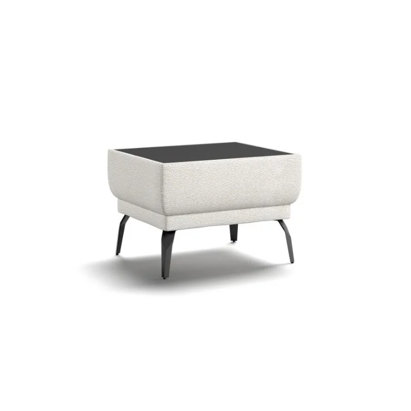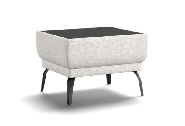 Kompaktowy stolik kawowy wyróżnia się nietypowym połączeniem twardego blatu z miękkimi bokami tapicerowanymi w harmonijnej szarej kolorystyce. Jego zaokrąglona forma i eleganckie metalowe nóżki w czarnym wykończeniu tworzą spójną kompozycję z pozostałymi elementami kolekcji. Minimalistyczny design sprawia, że mebel doskonale komponuje się zarówno w nowoczesnych, jak i klasycznych aranżacjach, nie dominując przestrzeni salonu.