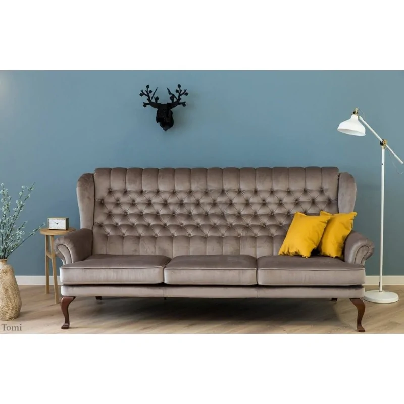 Gięte, drewniane nogi to ukłon dla stylu ludwikowskiego. Mocne pikowania to odpowiedź na współczesne piękno. Niskie siedzisko z cienkimi poduchami to prawdziwy design. Niebywała, nieszablonowa. Klasyczna pikowana sofa Tomi trafi w gusta koneserów piękna i sztuki. Artyzm widoczny w każdym elemencie sprawia, że taka luksusowa sofa stanie się sercem każdego salonu. Skupi na sobie całą uwagę, ozdobi, wzbogaci. Mocno zaakcentowane pikowania, w środkowej części oparcia, i nieco rzadsze w pozostałych. Wygląda to zjawiskowo. Wygięte w wewnętrzną stronę podłokietniki także są elementem dekoracyjnym. Można by przypuszczać, że tak luksusowa sofa nie ma nic więcej do zaoferowania. A jednak Tomi zachwyca również pod względem wygody i komfortu. Przy jej tworzeniu zastosowano piankę HR, która, w połączeniu ze sprężynami falistymi odpowiada za niezwykłą elastyczność i wyważoną miękkość. To sofa, na której wygodnie obejrzymy nie jeden film, ale trzy. To sofa, która otuli nas i pozwoli w komfortowej pozycji przeczytać książkę. Idealna Tomi poleca się najbardziej wymagającym.