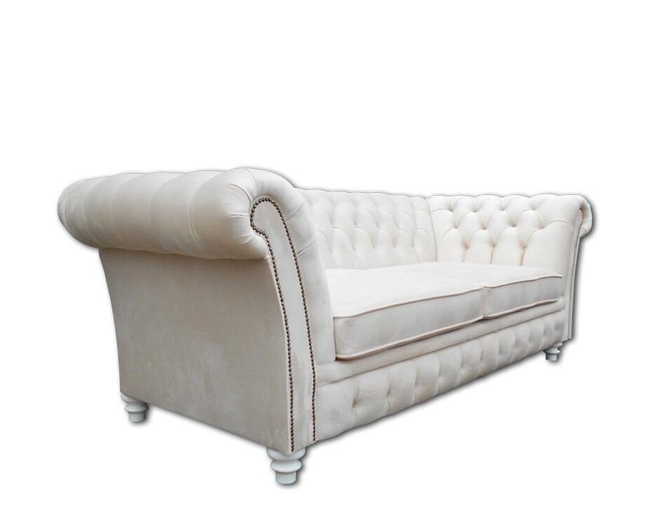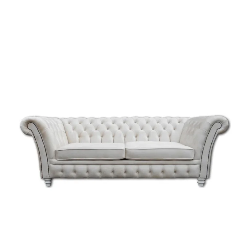 Sofa Chesterfield Neapol to synonim elegancji i luksusu w klasycznym wydaniu. Jej charakterystyczne, głębokie pikowania w stylu Chesterfield zdobią zarówno oparcie, jak i dolną część, tworząc efektowną, harmonijną całość. Delikatnie wygięte podłokietniki, zakończone ozdobnymi rolkami, nadają sofie ponadczasowego uroku, a wyprofilowane siedzisko zapewnia wyjątkowy komfort użytkowania. Tapicerka w jasnym, kremowym odcieniu podkreśla subtelny charakter mebla, a ozdobne pinezki biegnące wzdłuż podłokietników dodają wyrafinowania. Sofa Neapol doskonale wkomponuje się zarówno w przestrzenie o klasycznym wystroju, jak i nowoczesne wnętrza, stając się ich głównym punktem dekoracyjnym.