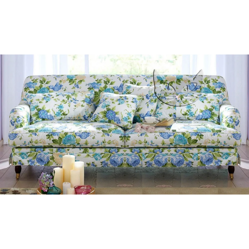 Sofa w kwiatowe wzory Florence to prawdziwie domowa, rodzinna kanapa do przyjemnych saloników we wnętrzach aranżowanych w stylu rustykalnym. Mebel jest szeroki i przestronny, ale nie tworzy wrażenia ciężkiego. To efekt niezbyt grubych poduszek siedziska i lekkiej podstawy dodatkowo umieszczonej na delikatnych, dekoracyjnych nóżkach. Nóżki te mają jeszcze jeden atut, ponieważ ułatwiają dostęp do podłogi pod kanapą i zapewniają komfortowe sprzątanie. Na kompozycję mebla składa się wspomniany stelaż z nogami oraz umieszczone na nim dwie duże poduszki siedziska. Dół ramy pod nimi ozdobiono swobodnie zwisającym paskiem tkaniny, przypominającym niemarszczoną falbankę. Oparcie sofy jest zintegrowane z całą konstrukcją, pozwalając na wygodne siedzenie z podparciem pleców i karku. Uzupełnieniem kanapy są dodatkowe pojedyncze poduszeczki, dzięki którym można przygotować sobie najwygodniejsze miejsce wypoczynku, zarówno w pozycji siedzącej, jak i leżącej. Boki kanapy ograniczają dwa podłokietniki, których szerokie, wyokrąglone narożniki ozdobiono układaną w zakładki tapicerką. Elementem designu, który decyduje o wyjątkowym klimacie mebla jest kwiecista tapicerka w pięknej, błękitno-białej tonacji. Sofa w kwiatowe wzory Florence to mebel niezwykle wygodny i wyjątkowo piękny w tym szczególnym, kobiecym stylu.