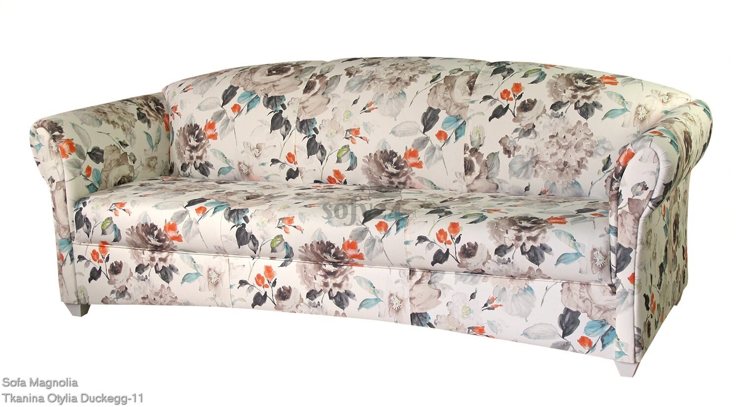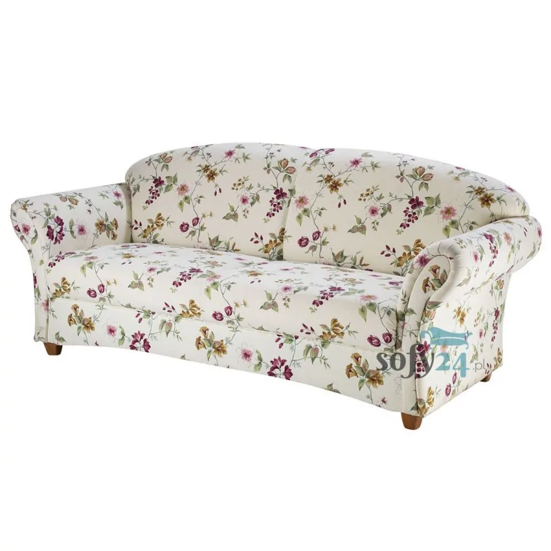 Sofa Magnolia 188 cm to mebel, który sprawi, że każdy salonik nabierze przytulności i naturalności typowej dla kobiecych wnętrz w klimacie francuskim, angielskim, rustykalnym lub shabby chic. O stylu mebla decyduje zarówno piękna, kwiatowa tapicerka w jasnym odcieniu, jak i charakterystyczne kształty, dalekie od kanciastości i surowego schematyzmu. Sofa jest zgrabnym, niezbyt dużym meblem wypoczynkowym, który z uwagi na brak funkcji spania może być elementem aranżacji małych pomieszczeń, w zestawieniu z niewielkim stolikiem kawowym lub ławą. W designie przyciągają uwagę łukowate linie wszystkich krawędzi modelu, które dodają mu płynności, lekkości i wdzięku. Lekko wyokrąglone na górze oparcie jest jednolitą częścią konstrukcji, podzieloną na pół pionowym przeszyciem. Podobną konstrukcję zastosowano w siedzisku, które tworzy jedna poduszka podzielona szwem. Dzięki temu kanapa zawsze pozostaje w idealnym stanie i nie wymaga ciągłego poprawiania poduszek. Łukowata jest także linia dolnej krawędzi podstawy, umieszczonej na masywnych nóżkach, typowych dla mebli w stylu angielskim. Nóżki unosząc kanapę ponad podłogę sprawiają, że jest lżejsza wizualnie i bardziej mobilna. Dopełnieniem całości są wygodne, lekko wywinięte na zewnątrz podłokietniki. Zarówno piękna forma mebla, jak i kwiatowe wory tapicerki sprawiają, że sofa Magnolia przenosi w świat przytulnych saloników sprzed lat.