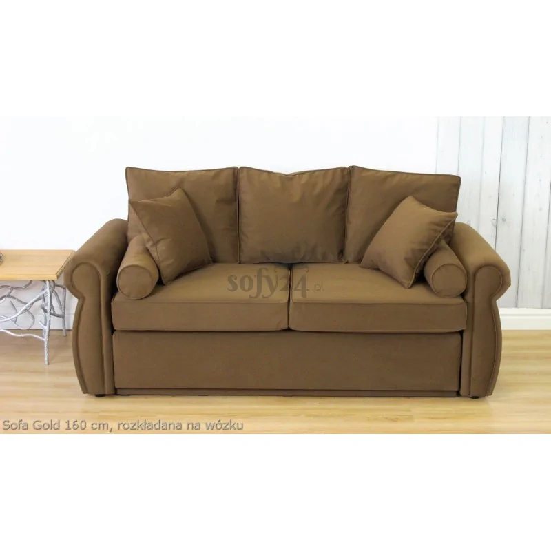 Klasyczna kanapa Gold zachęca do zanurzenia się w jej miękkich objęciach. Jej obła sylwetka i sprężyste poduchy, wyściełające tak siedzisko, jak i oparcie, kojarzą się z komfortem i ciepłem. Dodatkowe poduszki i wałki potęgują to wrażenie, pozwalając Ci na jeszcze wygodniejsze usadowienie się na sofie. Kanapa Gold jest wyposażona w funkcję spania, dzięki czemu zyskuje na praktyczności. Mechanizm na wózku pozwala na jej łatwe i szybkie składanie oraz rozkładanie, zapewnia także solidność całej konstrukcji. Dzięki temu łózko powstające przez rozłożenie sofy Gold nadaje się nawet do codziennego użytkowania.