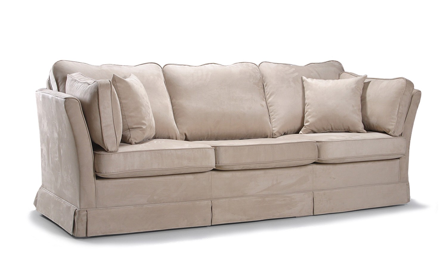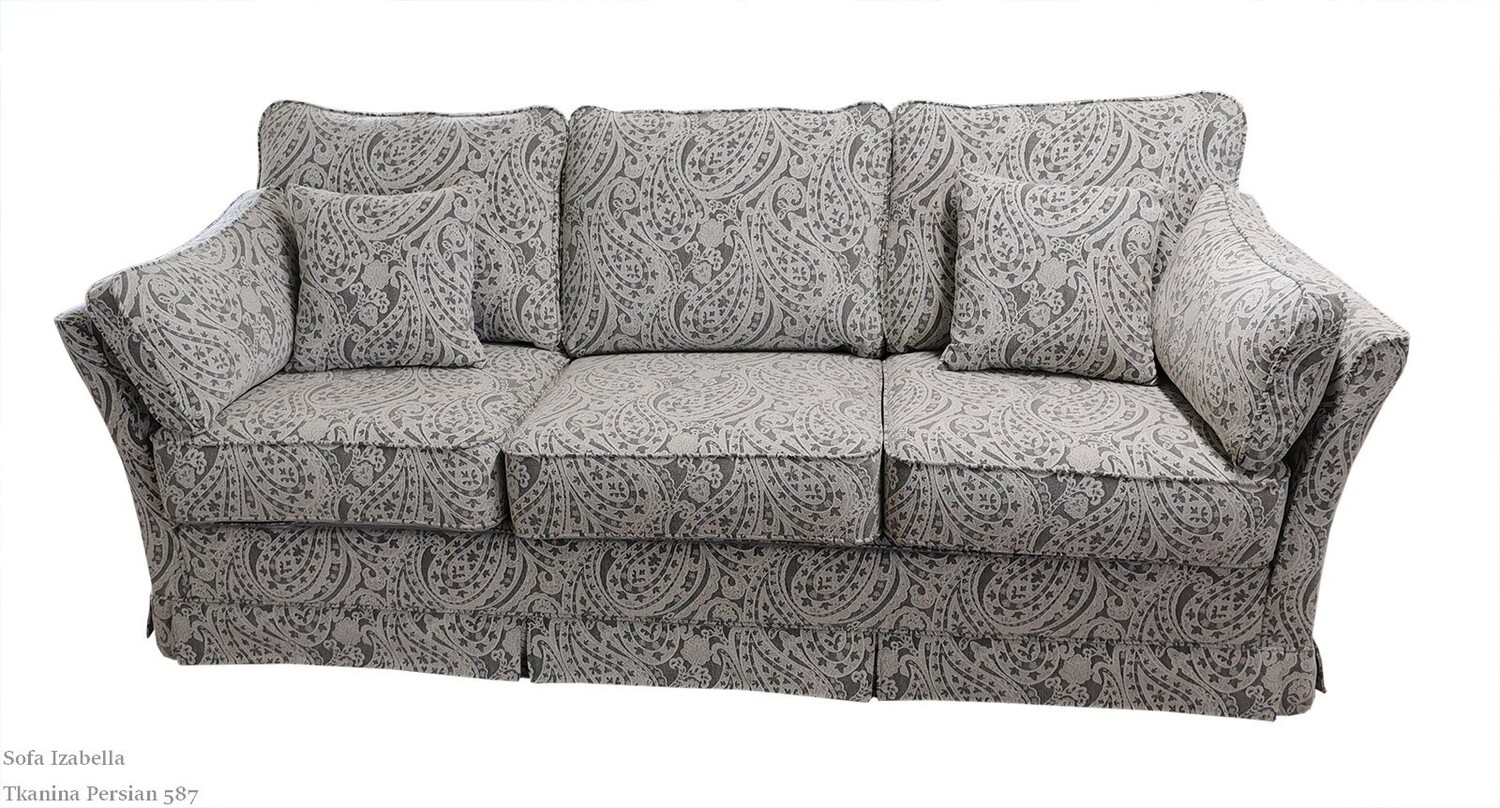 Sofa 2 osobowa Izabella jest meblem w stylu klasycznych zaprojektowaną z myślą o dwóch osobach. Już taki cel wpływa na jej ograniczone wymiary, a wysokie boki dodatkowo zmieniają optyczne proporcje modelu, podkreślając jego delikatność. Dzięki temu wykorzystana w mniejszym pomieszczeniu nie będzie tworzyć wrażenia klaustrofobicznego i nie zdominuje innych elementów wyposażenia. Pomimo lekkości i małych rozmiarów solidny akcent stanowią poduszki, które wykonano z charakterystycznymi szerokimi wstawkami we wszystkich bokach. Dzięki wstawkom nie zmieniają kształtu i nie spłaszczają się, zapewniając wygodę oraz idealnie dopasowując się do profilu sofy. Rozmiary poduszek oraz dodatkowe jaśki ozdobne sprawiają, że wypełniona nimi sofa jest też bardzo pięknym elementem dekoracyjnym wnętrza. Ciekawy efekt uzupełniają luźne pasy tapicerki na podobieństwo ozdobnych falbanek uzupełniające dolne krawędzie mebla. Możliwe jest też wykonanie modelu bez tych elementów, z dekoracyjnymi drewnianymi nóżkami.