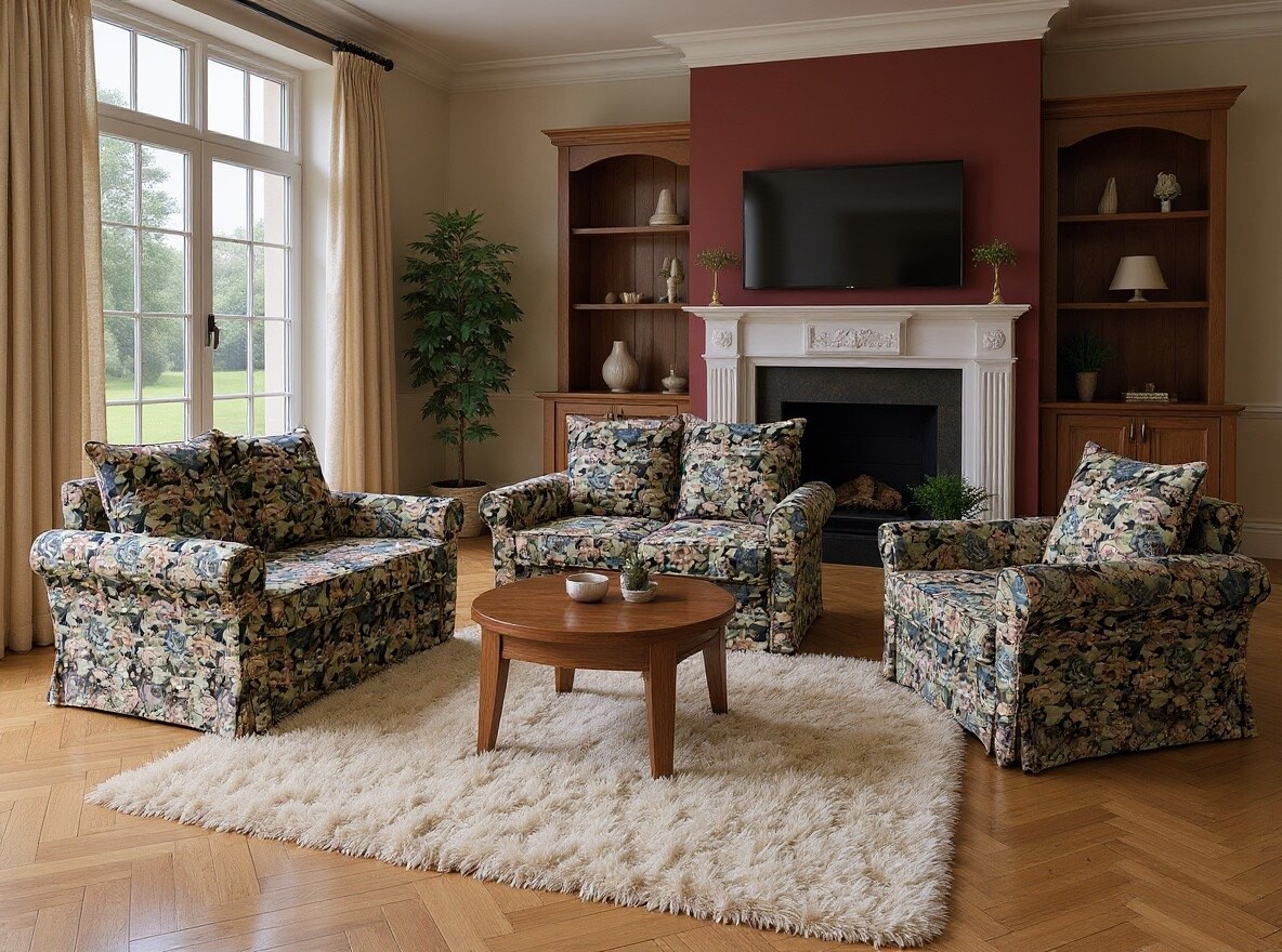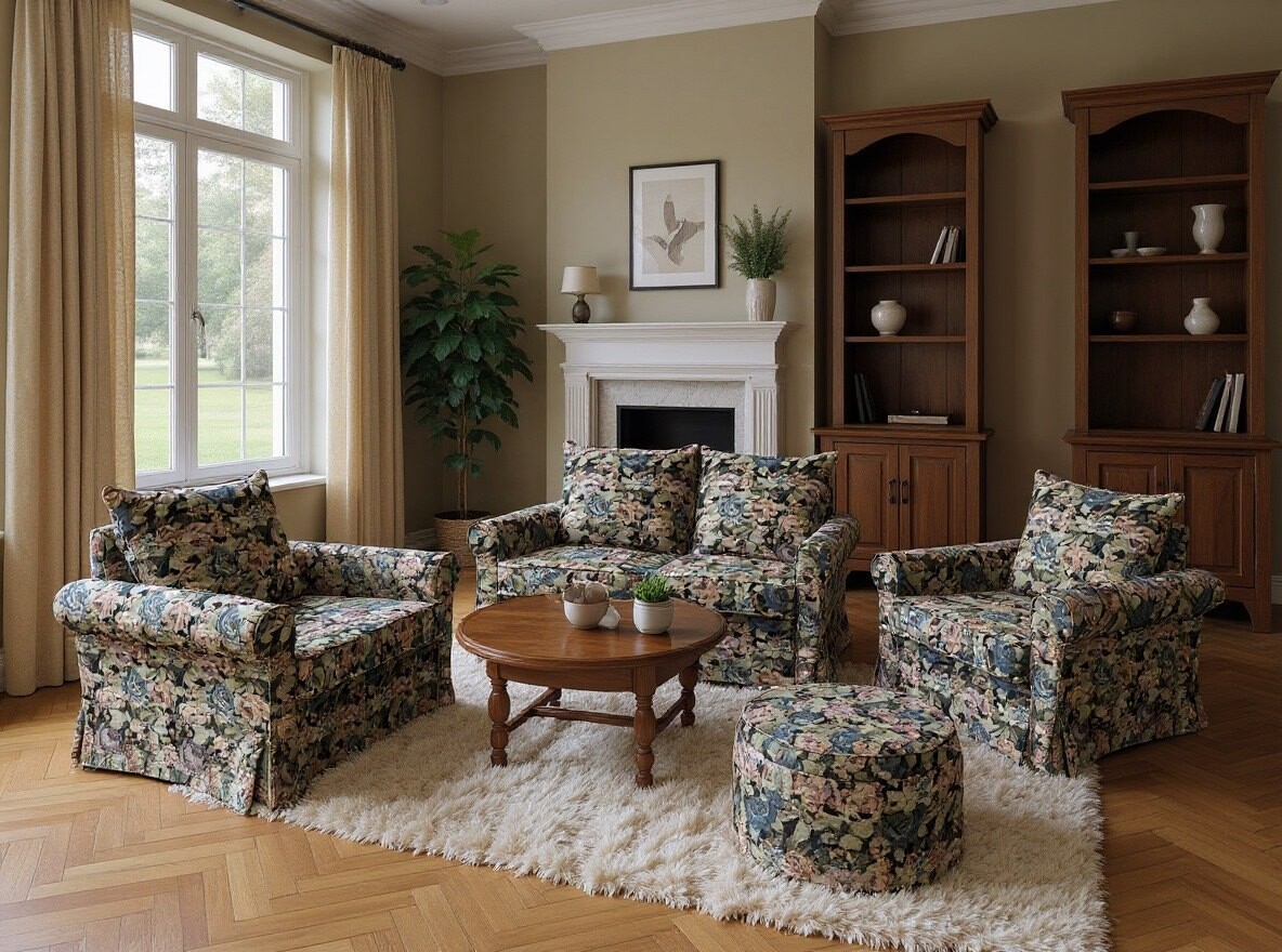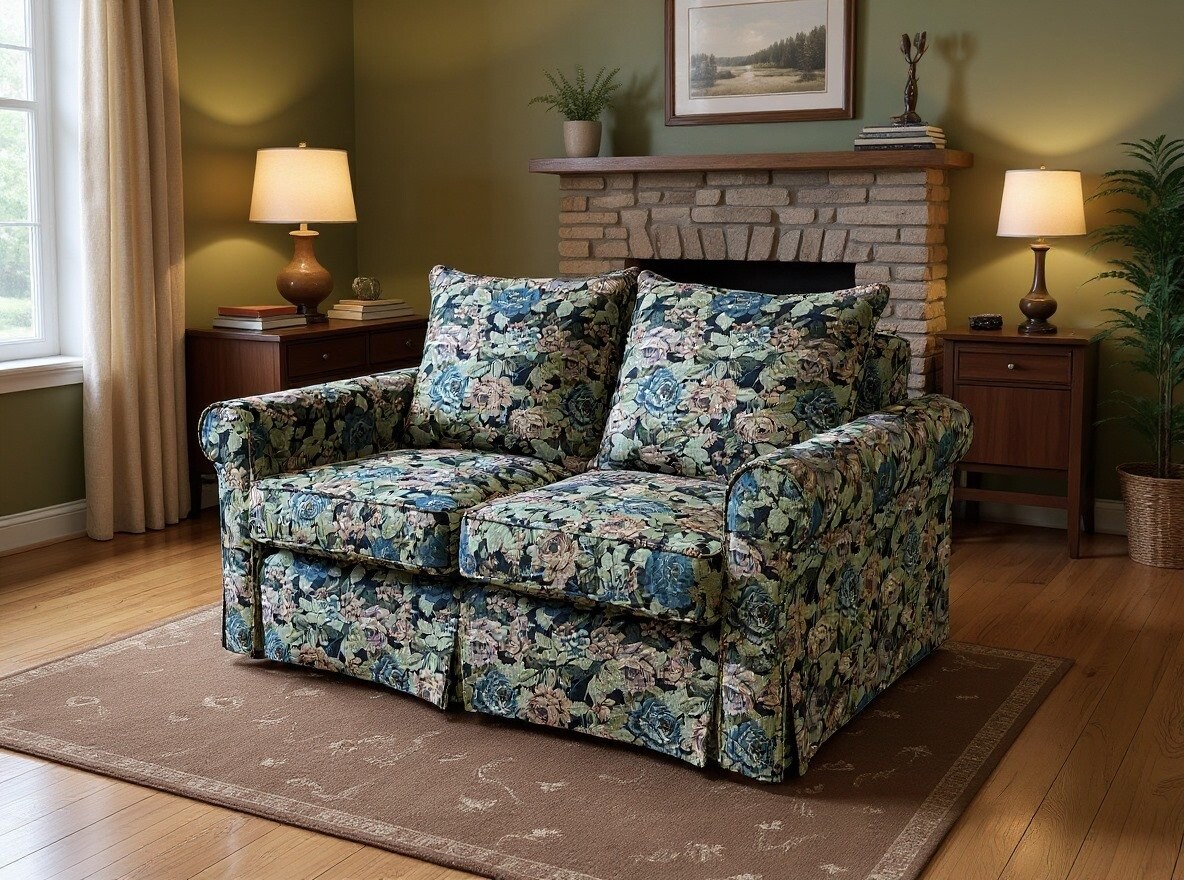 Elegancka sofa Aida Plus - z falbanką Ta sofa w kwiaty to stylowy mebel w duchu retro, który wnosi do wnętrza przytulność i subtelną nutę nostalgii. Prezentowana na zdjęciu wersja wykonana jest w tkaninie żakardowej, która podkreśla elegancki charakter mebla, jednak sofa może być również dostępna w innych rodzajach tkanin, dopasowanych do Twoich potrzeb. Miękkie poduszki i zaokrąglone kształty zapewniają wyjątkowy komfort, a kompaktowa szerokość 150 cm sprawia, że sofa doskonale sprawdzi się nawet w mniejszych wnętrzach.