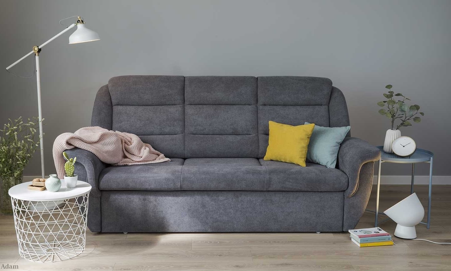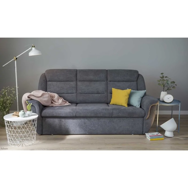 Kiedy szukamy idealnej kanapy do salonu, zastanawiamy się, jaką wybrać. Dużą, małą? Czy bardziej powinniśmy kierować się designem, czy jakością wykonania? Wiemy, że strefa odpoczynku jest najważniejszym miejscem w naszym mieszkaniu i domu. To właśnie w salonie tętni życie i dzieją się najważniejsze sprawy. Klasyczna kanapa z wysokim oparciem Adam spełni każde nasze marzenie względem idealnego mebla wypoczynkowego. Jest tak samo piękna, stylowa, jak wygodna i komfortowa. Pasuje do wnętrz otwartych, jak i tych o mniejszych metrażach. Piękna sylwetka znajduje swoje odzwierciedlenie w zawiniętych bokach tworzących jednocześnie wygodne podłokietniki. Wysokie oparcie z przeszyciami to nie tylko designerski zabieg estetyczny, ale także wsparcie naszych pleców i szyi. Kanapa pięknie prezentuje się w szarościach i pozostawia wiele możliwości aranżacyjnych. Możemy jednak wybrać inną tkaninę obicia spośród szerokiego wachlarzu. Adam ma funkcję spania, więc dodatkowo przyczyni się do stworzenia przestrzeni zaplanowanej i niezwykle użytecznej.