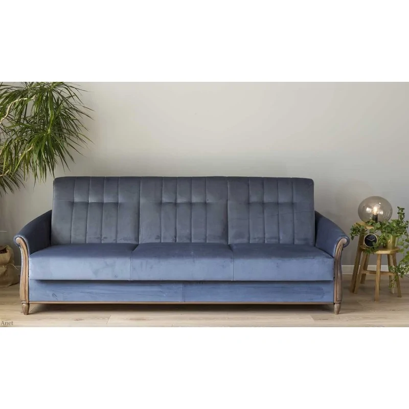 Klasyczna wersalka do salonu Anet 220 cm - W wersalce odnajdziemy wszystko, czego pragniemy, aby upiększyć nasze wnętrze. Nie brakuje jej kunsztu i wykwintności. Jest niezwykle estetyczna, więc nada harmonii i spokoju. Każdy jej element to owoc rzemieślniczej pracy i wielkiej pasji. Wystarczy tylko spojrzeć na jej piękne, rzadko spotykane przeszycia. Drewno w tym przypadku ma podwójną moc i siłę. Delikatne gięcia podłokietników, niczym otwarte ramiona, zapraszają do odpoczynku. Odpoczynek na niej to prawdziwa przyjemność. Materiały użyte do stworzenia tak pięknego mebla gwarantują dopasowanie się do każdego. Wyważona miękkość to właśnie jej największy atut. Istna perła wśród klasycznych wersalek. Dzieło sztuki, które jest także funkcjonalne. Umożliwia domownikom relaks, a kiedy trzeba – służy posłaniem. Wszystko za sprawą dobrze „ukrytej” u podstawy funkcji spania. Kiedy dodamy do tego jeszcze pojemnik na pościel i gwarancję jakości, spełnią się wszystkie nasze marzenia względem stylowego i luksusowo zaaranżowanego salonu.