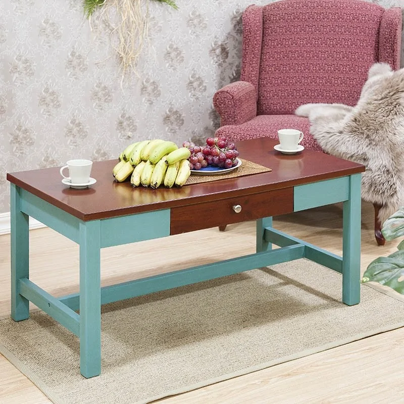 Stolik kawowy do salonu Emilio to prosty, ale ciekawy wizualnie i bardzo stylowy mebel do salonu. Wykonany z drewna charakteryzuje się dużą wytrzymałością, a jego schematyczne kształty, typowe dla stylu rustykalnego urozmaica ciekawe połączenie kolorów oraz elegancki fornirowany blat. Stolik jest niewysokim meblem złożonym z ramy na czworokątnych nogach, umieszczonego na niej blatu oraz dodatkowej listwy łączącej nogi nad podłogą. Listwa stanowi ciekawe urozmaicenie kompozycji, ale zabezpiecza też nogi stolika przed rozchwianiem, dzięki czemu mebel zachowa nienaganny wygląd przez lata. W ramę pod blatem stolika wbudowano pojedynczą szufladę zajmującą centralną część konstrukcji. Front szuflady w formie gładkiej płyty został tak dopasowany do ramy, że tworzy z nią jedną równą powierzchnię. Elementem, który ją wyróżnia jest kolor frontu, podobnie jak blatu pokrytego fornirem. Dzięki zastąpieniu tradycyjnej dolnej półki niewielką listwą, kompozycja zyskała na lekkości i delikatności zrównoważać schematyczną formę i sprawiając, że stolik jest bardzo ciekawym elementem wystroju wnętrza. Pomimo swojej prostoty stolik kawowy do salonu Emilio jest ciekawym i bardzo zgrabnym meblem, który doskonale sprawdzi się w niezbyt dużych salonach, jako dopełnienie kompletu wypoczynkowego.