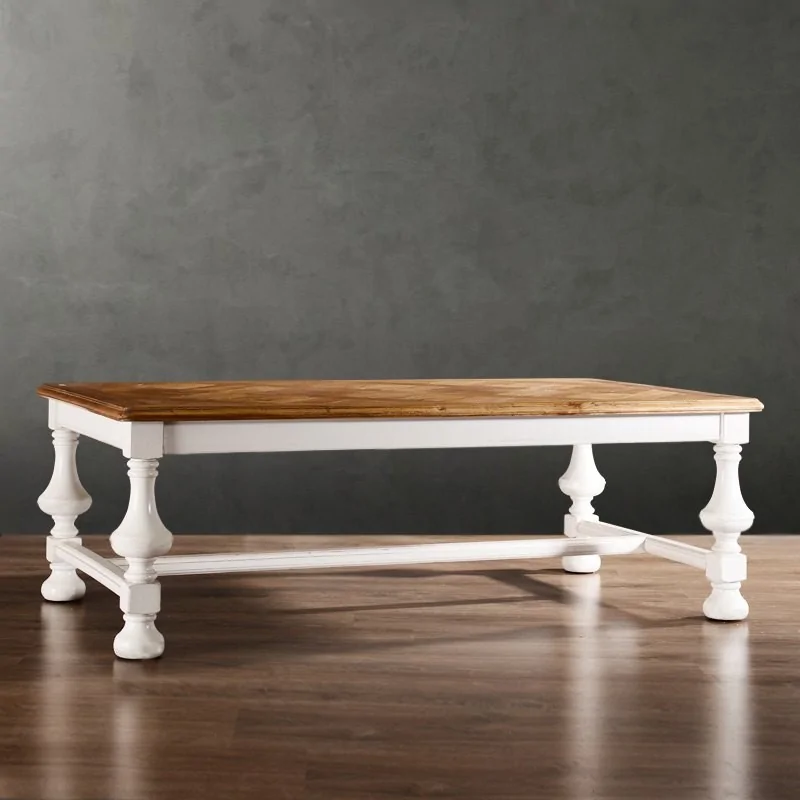 Leonardo to piękna drewniana ława w stylu prowansalskim, która zmieni klimat wnętrza wprowadzając do niego ten charakterystyczny nastrój domów z dawnej epoki. To przemyślane połączenie wysokiej funkcjonalności mebla z jego walorami dekoracyjnymi, wyrażonymi zarówno kontrastem pomiędzy bielą i naturalnym drewnem, jak i pięknymi toczonymi nogami. Mebel jest niewysoki, ale przestronny, dlatego doskonale wypełni przestrzeń w strefie wypoczynkowej salonu wraz z fotelami i miękką tapicerowaną sofą. Ława ma formę wydłużonego prostokąta, a jej podstawę tworzy rama z litego drewna uzupełniona czterema fantazyjnie ukształtowanymi nogami. W ich formie wyróżniają się dwa pękate elementy przypominające antyczne dzbany. Dolny umieszczony jest tuż przy podłodze i stanowi oparcie dla dodatkowych listew spajających konstrukcję w zwartą całość i chroniących ją przed rozchwianiem. Dodatkowe listwy łączą nogi z boku mebla i są jeszcze spojone długą listwą umieszczoną centralnie wzdłuż blatu. Sam blat wykonany jest z naturalnego drewna, które zdobi mebel nie tyko pięknym kolorem, ale też niepowtarzalnym rysunkiem, który jest doskonałym dziełem natury. Ława w stylu prowansalskim Leonardo dostępna jest też w innych wersjach kolorystycznych, pozwalających na dopasowanie jej do aranżacji wnętrza.
