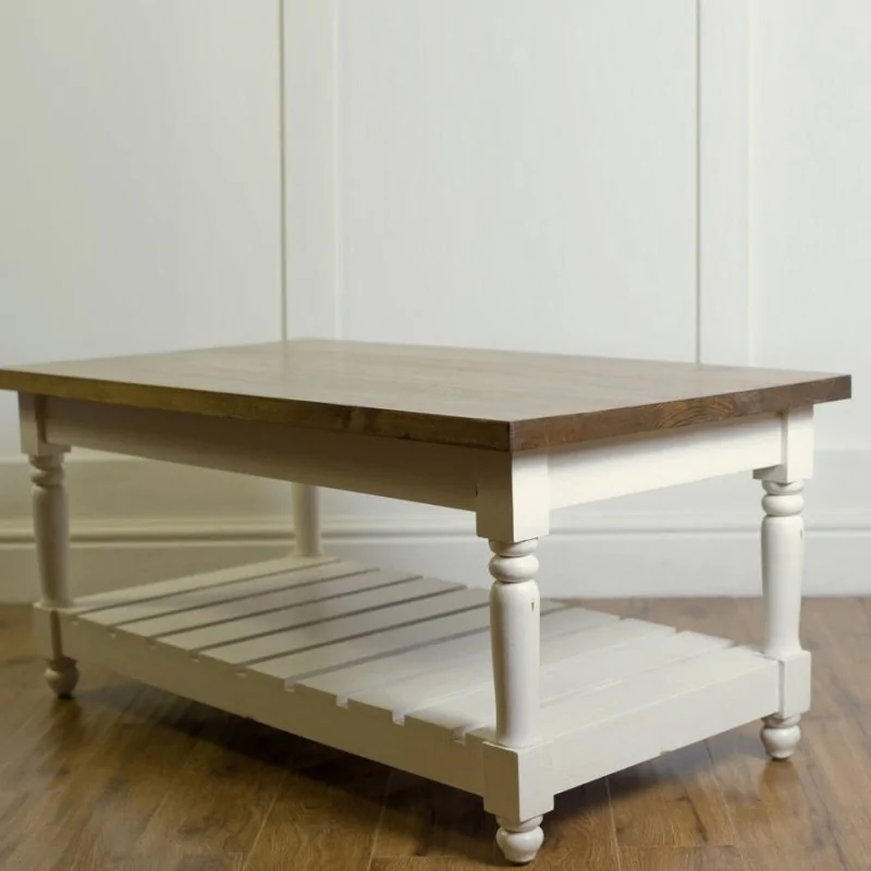 Stolik drewniany Zadar to mebel, który przyciąga uwagę swoim designem, każdym detalem nawiązując do klimatu wiejskich domów z początku ubiegłego wieku. W modelu zaznaczają się cechy stylu prowansalskiego, ale również jest to doskonały dodatek do wnętrz rustykalnych. W kompozycji modelu wyróżnia się ciekawe połączenie białej podstawy z ciemnym, drewnianym blatem, które tworzy fantazyjny, a zarazem wskazujący na związek z naturą kontrast. Stolik drewniany pomimo niedużej wysokości sprawia wrażenie stabilnego i masywnego, co jest wynikiem grubej dolnej półki urozmaiconej ażurową powierzchnią z niewielkich deseczek. Prześwity nie tylko minimalizują ciężar optyczny, ale też zapewniają przewiew powietrza i eliminują gromadzenie się wilgoci. Stolik drewniany ma kształt prostokąta, dlatego doskonale dopasowuje się do wersalki lub kanapy zapewniając wygodny dostęp do blatu wszystkim odpoczywającym osobom. Stolik drewniany Zadar wyposażono w piękne toczone nogi, które podkreślają styl retro mebla i dodają mu sporo wdzięku. To idealny model do aranżacji prowansalskich i rustykalnych.