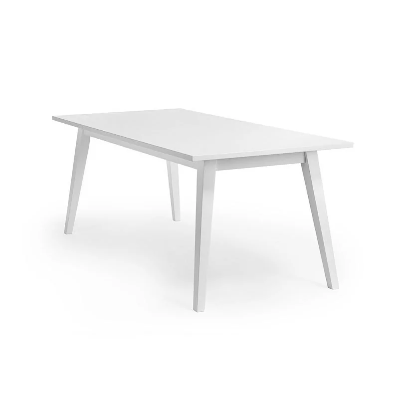 Biały drewniany stół Como to typowy przykład nowoczesnego stołu, którego bryła charakteryzuje się lekkością optyczną, związaną z delikatnym, cienkim blatem i wysmukłymi nogami. Charakterystycznym elementem przyciągającym uwagę jest ustawienie nóg pod w sporym odchyleniu od pionu, dzięki czemu przypominają rodzaj drewnianego kozła o wyjątkowej stabilności i zarazem ze sporą dozą wdzięku. Nogi o czworokątnym przekroju są dodatkowo wyszczuplane ku podłożu zwiększając efekt smukłości i lekkości modelu.