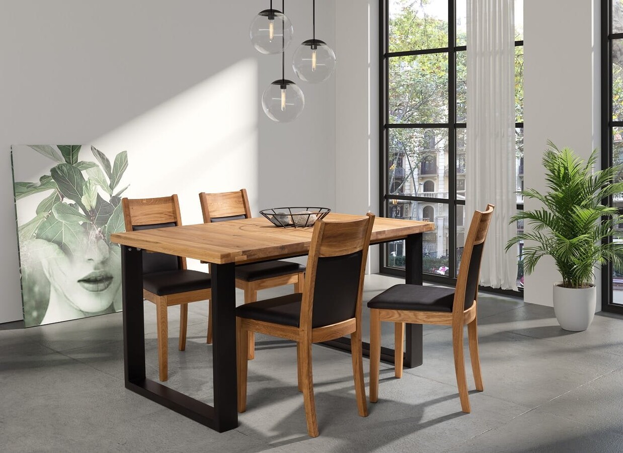 Stół Prego 180 x 100 cm to kwintesencja minimalistycznego, industrialnego stylu, który doskonale łączy naturalne drewno dębowe z surowością metalowej podstawy. Blat z litego drewna dębowego, o grubości 6 cm na brzegach, podkreśla solidność konstrukcji i dodaje meblowi masywnego, eleganckiego wyglądu. Zabezpieczenie olejem sprawia, że drewno jest odporne na codzienne użytkowanie, a jego piękne, naturalne usłojenie staje się bardziej wyraziste.