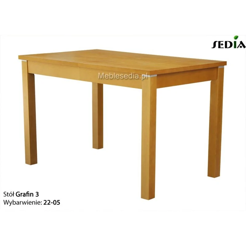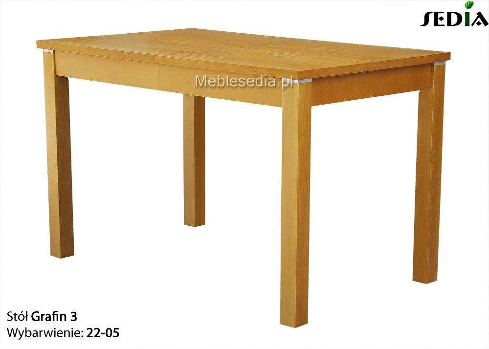 Grafin to model bardzo specyficzny, bowiem z jednej strony nie wyróżnia się żadnym wyszukanym designem, a z drugiej jest wyjątkowo funkcjonalny. Po złożeniu prostokątny blat ma zaledwie 120 lub 130 cm długości, co pozwala na ustawienie nawet w niewielkim kącie pokoju. W jadalni taki mebel z powodzeniem zaspokoi potrzeby czteroosobowej rodziny zapewniając im wygodne miejsce podczas posiłków. W stanie rozłożonym blat może zostać wydłużony nawet o 3 panele szer. 60 cm, czyli zyskuje prawie dwa metry przestrzeni dla dodatkowych stołowników. Dużym atutem może być sposób rozsuwania stołu. Blat przemieszczany jest wraz z nogami, które po rozłożeniu znajdują się na końcach nie ograniczając miejsca osobom siedzącym na środku.