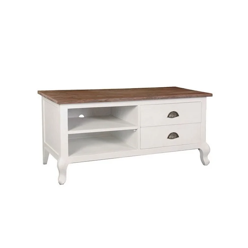 Komoda rtv vintage Mio to piękny, klasyczny mebel vintage w nieco mniejszej wersji, który doskonale zaspokoi potrzebę ekspozycji sprzętu w małym salonie. Dzięki swoim rozmiarom komoda doskonale sprawdzi się w stylowo aranżowanych wnętrzach mieszkań zbiorowego budownictwa, a także w niewielkich domkach jednorodzinnych. Mebel nie jest duży, ale bardzo funkcjonalny, a także wyjątkowo piękny. W jego designie zaznacza się dbałość o szczegóły i wierność klimatowi dawnych lat. Mio to komoda w całości wykonana z dębowego drewna, które z samej natury wyróżnia się solidnością i trwałością. Ten szczególny charakter dodatkowo podkreśla pozostawienie blatu w stanie naturalnym, dzięki czemu kontrastując z bielą konstrukcji tworzy on bardziej realną kompozycję retro. Wnętrze komody podzielono na dwie części, wśród których jedną wypełniają dwie wnęki na sprzęt RTV, a drugą para pojemnych szuflad na różne akcesoria. Dopełnieniem stylowego klimatu są pięknie ukształtowane przednie nogi mebla oraz charakterystyczne, półkoliste metalowe uchwyty szuflad. Ważnym walorem praktycznym jest też otwór wykonany w tylnej ściance mebla, ułatwiający przełożenie kabli montażowych. Pomimo niewielkich rozmiarów komoda RTV Mio to mebel o wysokich walorach dekoracyjnych, wnoszący do wnętrza elegancję i klimat dawnych lat.
