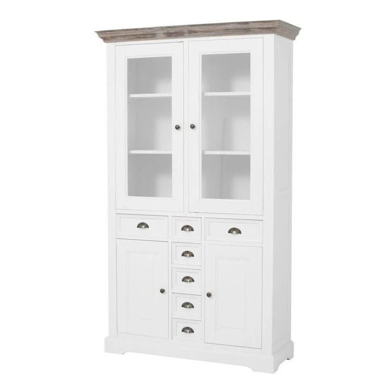Witryna vintage Lori to mebel, który imponuje piękną harmonijną kompozycją typową dla wyposażenia w starym stylu. Wykonana z litego drewna wyróżnia się pewną szlachetnością, jaka stanowi nieodłączny element przedmiotów z długą historią. Doskonale odtworzony klimat dawnych lat to sposób na przeniesienie go do wnętrza, w którym znajdzie się ten niezwykły mebel. Kompozycja ma charakter praktyczny i dekoracyjny, a pełnienie obu tych funkcji jest efektem wyjątkowo starannie przemyślanego wnętrza. Ozdobna góra to przeszklona dwudrzwiowa szafka z półkami umożliwiająca piękne wyeksponowanie dekoracyjnych naczyń, bibelotów, cennych książek czy prywatnej kolekcji. Dolna część o walorach praktycznych to dwie zabudowane szafki oraz siedem szuflad ułożonych w formę litery T. Umieszczona pomiędzy szafkami kolumna niewielkich szufladek jest bardzo ciekawym urozmaiceniem kompozycji przyciągając uwagę do licznych detali, niewielkich frontów, wklęsłych powierzchni czy metalowych uchwytów. Witryna vintage Lori jest meblem stylowym w każdym calu, a jej klimat przeszłości wzmacnia jeszcze solidne zwieńczenie z drewna dębowego wykończone efektem postarzania. Witryna w białym kolorze pomimo sporych rozmiarów nie będzie przytłaczać, lecz doda wystrojowi wnętrza stylowego uroku.