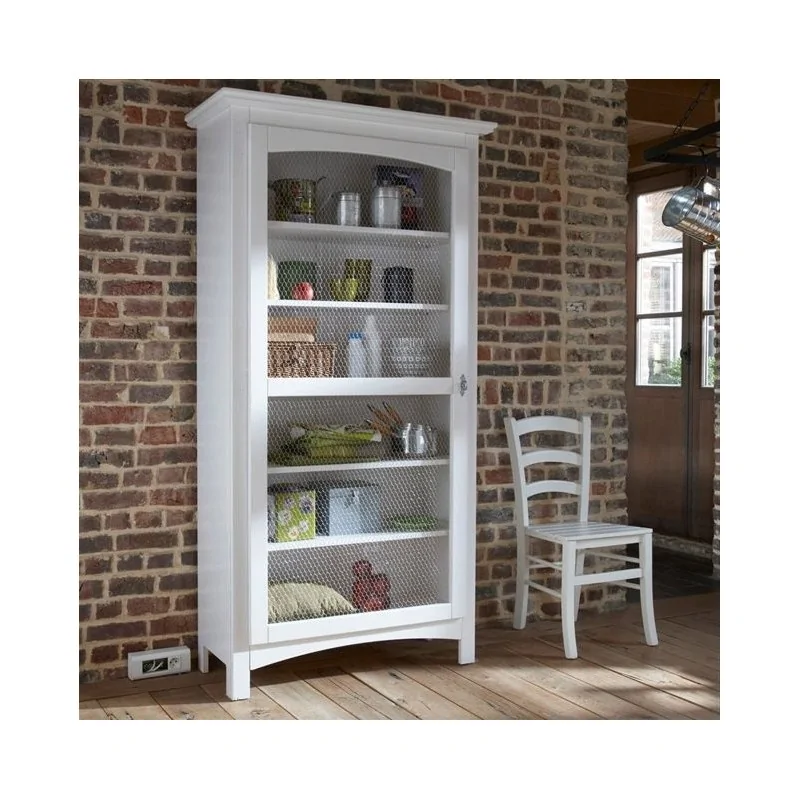 Ciekawa witryna rustykalna Lozanna w delikatnym białym kolorze jest typowym przedstawicielem prostych mebli rustykalnych, przyciągającym uwagę niestandardową organizacją wnętrza zamkniętą drzwiami z metalową siatką. Mebel jest kompozycją opartą na bardzo prostej bryle, której surowość łagodzi nieco szersze, dwupoziomowe zwieńczenie góry oraz umieszczona na zewnątrz zasadniczej konstrukcji rama drzwi. Te ostatnie wyróżniają się łukowatym profilem górnej krawędzi oraz wypełniającą ich światło siatką, która chroni wnętrze i jego zawartość pozwalając jednocześnie na podziwianie piękna wyeksponowanych przedmiotów. Witryna rustykalna jest szeroka i wyposażona w długie półki zajmujące całą przestrzeń wnętrza, dlatego oferuje sporo miejsca do zagospodarowania i tworzenia ciekawych ekspozycji cennych przedmiotów. To również mebel bardzo praktyczny z uwagi na formę i parametry, dzięki którym doskonale sprawdzi się również w mniejszym pomieszczeniu, zajmując niewiele miejsca pod ścianą. Lozanna to witryna, która swoim pięknem i unikalnością wzbogaci każdy wystrój wnętrza.