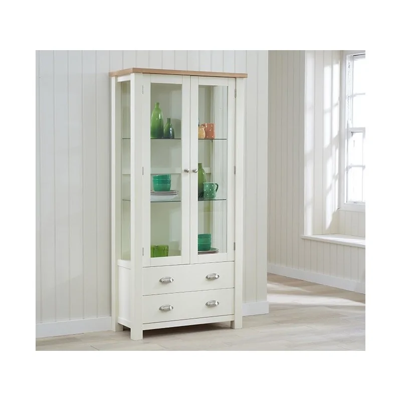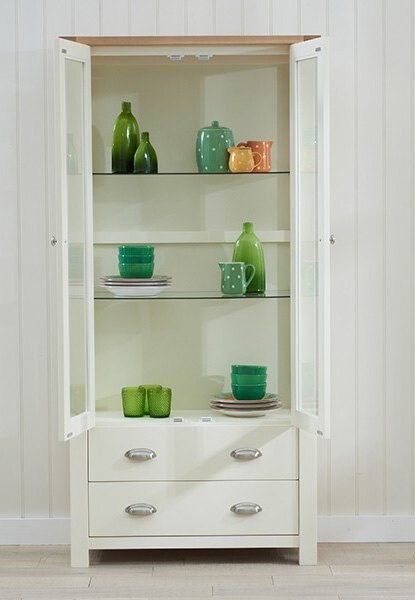 Witryna w stylu skandynawskim Kler jest elegancką kompozycją w stylu skandynawskim, której urok kryje się w prostych liniach krawędzi i ciekawym wykończeniu narożników. To również ciekawy kontrast jasnego designu z drewnianym blatem wieńczącym szczyt mebla. Zarówno prosta forma, jak i dodatek surowego drewna są typowymi cechami stylu, szczególnie silnie związanego z naturą i trwałymi materiałami. W kompozycji mebla zwraca uwagę specyficzne połączenie czterech wysokich belek z wbudowaną pomiędzy nie zasadniczą bryłą, dzięki czemu witryna sprawia wrażenie utrzymującej się na wysokich szczudłach. Górną część szafki wyposażono w wysokie przeszklone drzwi, których szyby stanowią jedną całość dodając witrynie elegancji i delikatności. Kontrastowym, mocniejszym akcentem są dwie duże, pojemne szuflady z podwójnymi uchwytami. Witryna w stylu skandynawskim posiada też przeszklone boki pozwalające nas oglądanie ekspozycji na półkach z każdego miejsca w pokoju. Witryna w stylu skandynawskim Kler to typowy mebel ekspozycyjny, który ozdabia wnętrze swoim niebanalnym pięknem rodzinnego stylu skandynawskiego.