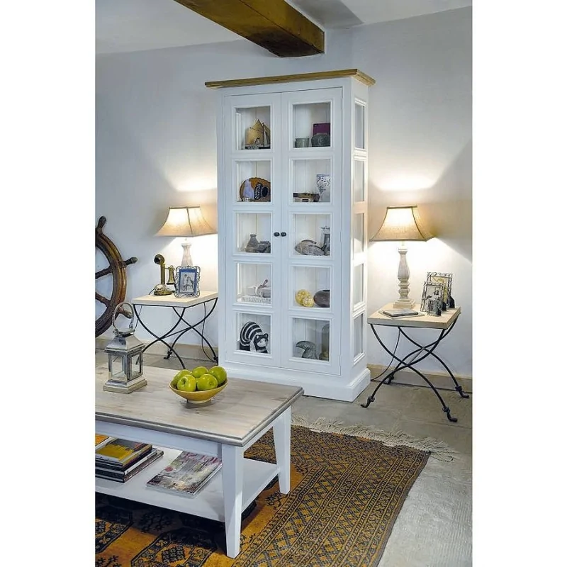 Witryna do salonu Anatola powstała z myślą o stylowych salonach, w których będzie wyraźnie zaznaczać swoją obecność dominującą sylwetką. Mebel nie należy do bardzo dużych, bowiem poza standardową wysokością wyposażony jest tylko w jedne podwójne drzwi, jednak jego konstrukcja tworzy wrażenie ciężkiej i masywnej. Taki efekt uzyskany został przez wyposażenie przeszklonych drzwi w szerokie ramy oraz gęsto ułożone poprzecze listwy, dzięki którym szyby dzielone są na małe kwadratowe okienka. Podobny design wyróżnia też boki witryny wypełnione na całej wysokości szklanymi kwadratami. Przeszklona z trzech stron witryna to idealne miejsce do tworzenia efektownych dekoracji, doskonale widocznych z każdego miejsca pokoju. Z drugiej strony ozdobą jest już sam mebel, będący piękną i bardzo urozmaiconą kompozycją bielonego drewna i szkła. Witryna do salonu Anatola posiada też dodające jej wiejskiego uroku stylowych mebli zwieńczenie w postaci naturalnego drewnianego blatu. Dół tworzy masywna podstawa, dzięki której mebel nabiera jeszcze większej stabilności wizualnej. To wyjątkowo elegancka i piękna witryna do stylowych salonów.